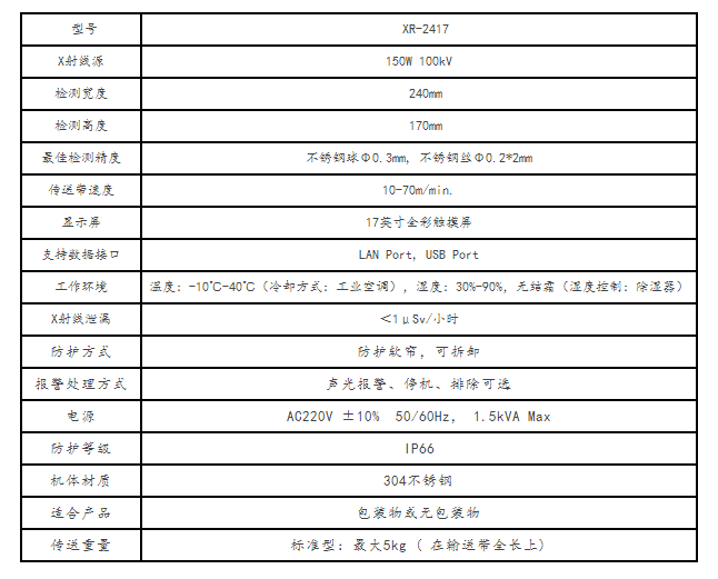XR-2417 X射線異物檢測機,適用于餅干,薯片,嬰幼兒食品,藥品等小袋包裝物料的檢測。應用于食品、醫(yī)藥、化工行業(yè)的金屬與非金屬異物檢測。不但能靈敏識別產(chǎn)品中的各種異物,如金屬、骨頭、玻璃、陶瓷、石子、硬質(zhì)橡膠、硬質(zhì)塑料等,而且能提供的產(chǎn)品完整性檢測,識別產(chǎn)品缺陷,缺損等。