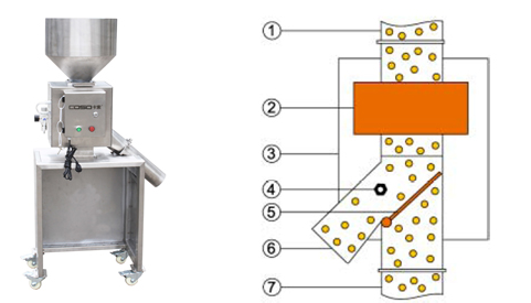 ①下料管 ②檢測線圈 ③控制器 ④ 金屬雜質(zhì) ⑤剔除板 ⑥廢料口 ⑦合格料下料管