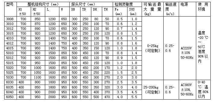 1. 表中所列檢測(cè)靈敏度是將測(cè)試卡放在輸送帶中間通過檢測(cè)通道所得出的檢測(cè)靈敏度,實(shí)際檢測(cè)靈敏度根據(jù)被檢測(cè)產(chǎn)品  的特性或工作環(huán)境的不同可能會(huì)有所差異,應(yīng)以實(shí)際檢測(cè)靈敏度為準(zhǔn);