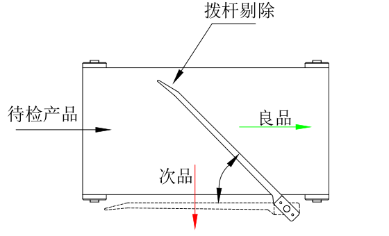 如下圖所示,綠色箭頭→表示合格產(chǎn)品輸送方向,紅色箭頭→表示不良品吹落方向。